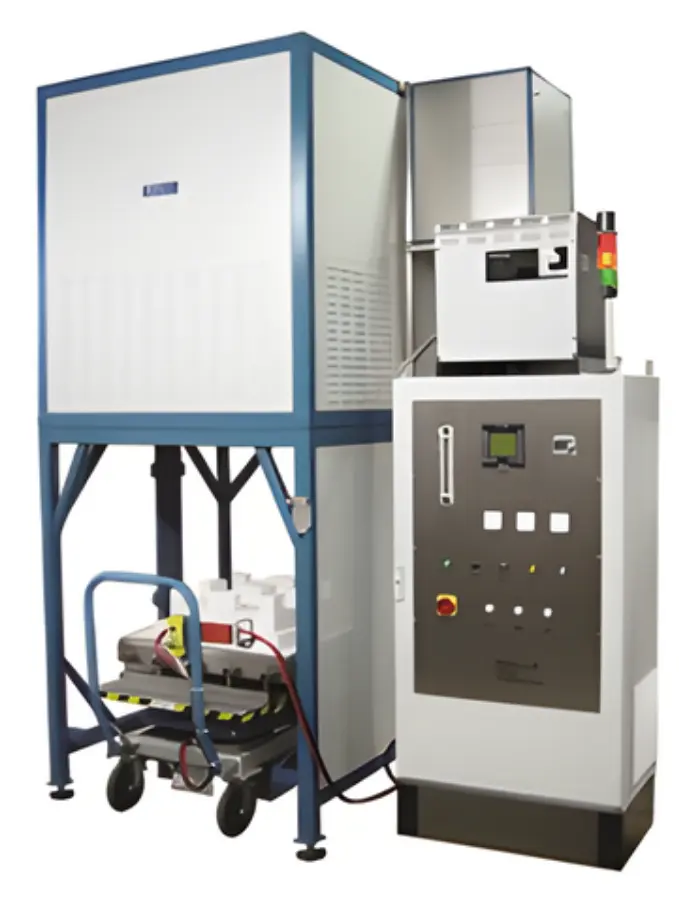 The Linn High Temp FBV-Vac Series is a vacuum-tight cold-wall bottom-loading oven designed for fast thermal cycles. It features a double stainless-steel housing and ceramic fiber board insulation (FBV), ensuring efficient heat retention. The heating system consists of U-shaped MoSi₂ ceramic heating elements suspended from the oven roof, providing four-sided heating for excellent temperature uniformity and high power.