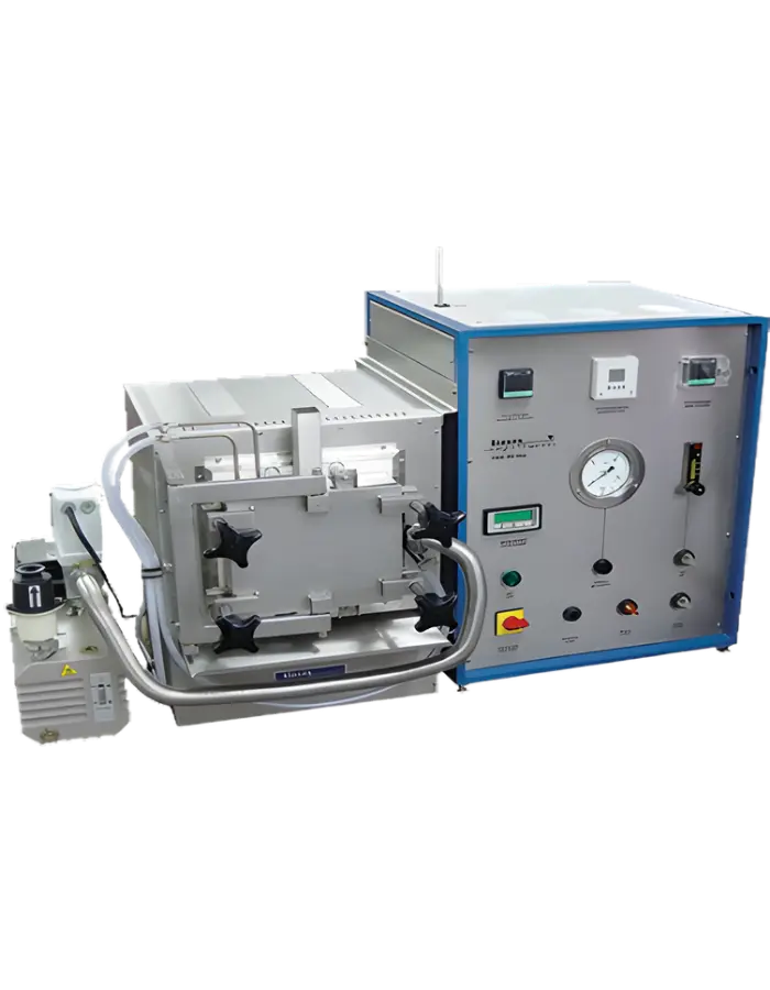 The Linn High Temp VMK-Vac-Series is a compact and efficient vacuum hot-wall laboratory furnace designed for fast heating cycles. It features a durable stainless-steel housing that provides excellent protection against corrosion and is equipped with a standard safety controller for secure operation. The furnace includes a ceramic fiber muffle for insulation and a metal alloy spiral heater embedded within the insulation, ensuring optimal performance and reliability.